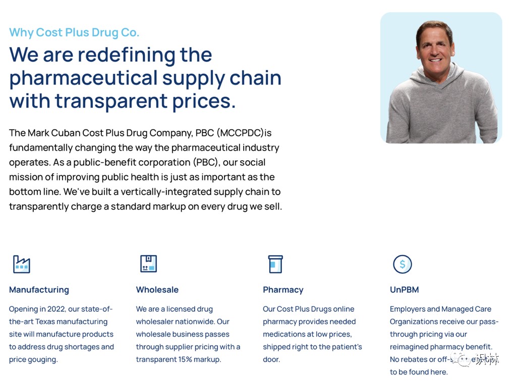 美国亿万富翁 Mark Cuban 宣布在美国成立 Mark Cuban Cost Plus 制药公司。https//costplusdrugs.com/patient 公司网站称将“致力于生产高价仿制药的低成本版本”,并声称每个人都将以相同的低价获得其生产的药物。