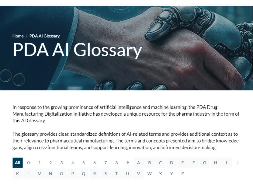 近日,作为制药业主流技术协会,美国注射剂协会(PDA)为应对人工智能(AI)和机器学习日益突出的重要性,通过其药品制造数字化倡议开发了一套专为制药行业量身定制的独特资源——AI术语表。该术语表提供了清晰、标准化的AI相关术语定义,并增补与药品制造相关的背景信息。