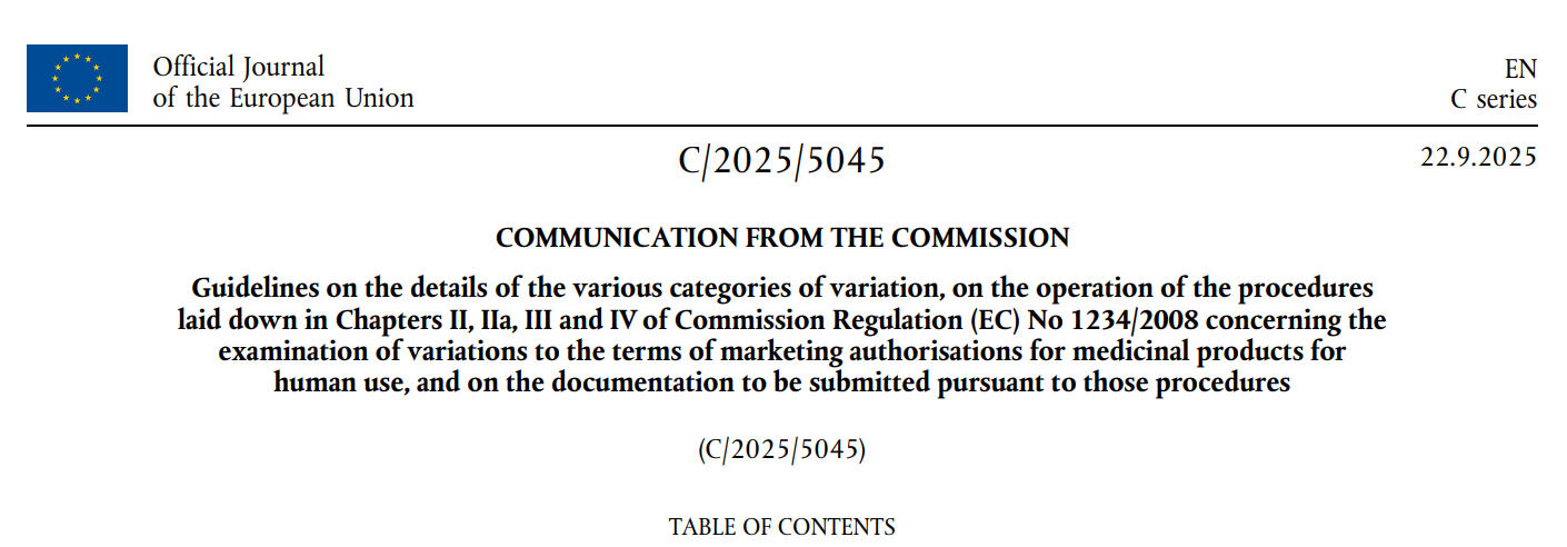 9月22日,欧盟委员会(European Commission,EC)发布了最终版《药品变更指南》(Variations Guidelines),明确该指南自2026年1月15日起正式适用。该指南现行版发布于2013年8月,分别在2024年6月和2025年6月两次征求意见。
