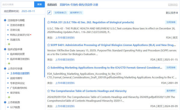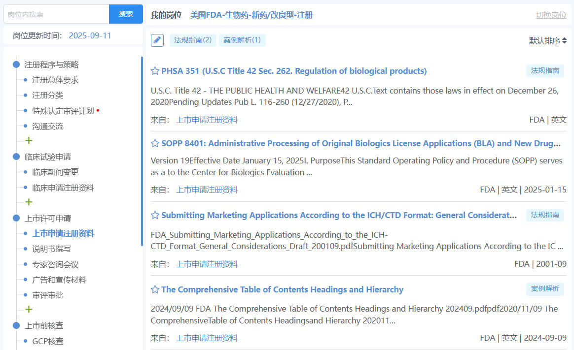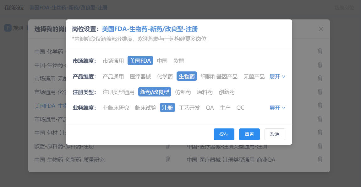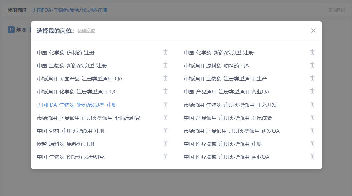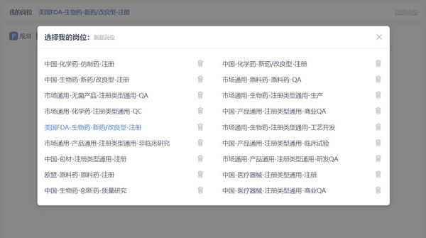 点击新建岗位--如,选择 美国FDA-生物药-新药/改良型-注册