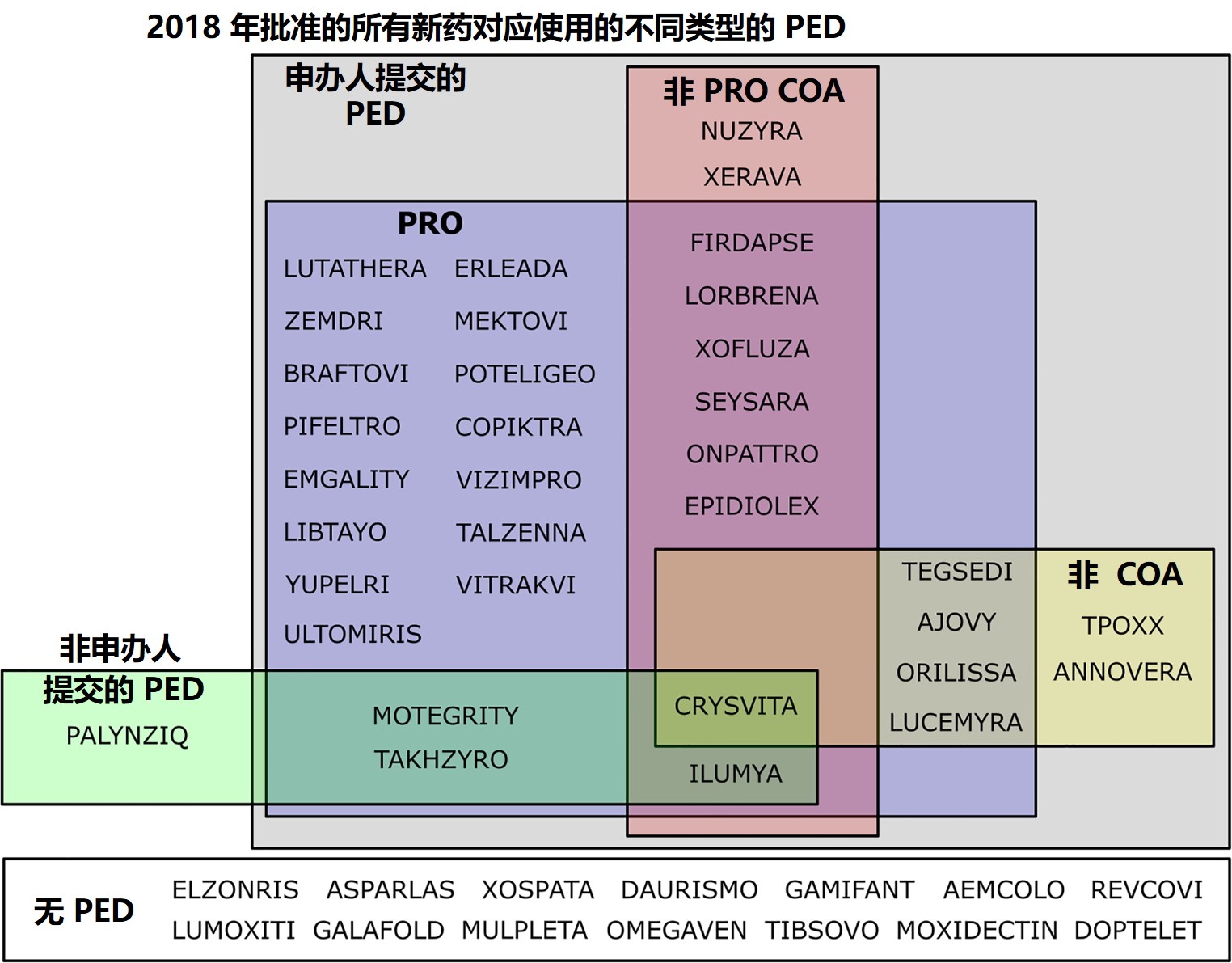 在 FDA 2018 年批准的 59 件药品申请中,有 48 件(81.4%)在审评文件中包含 PED 表。11 件审评文件内不包含 PED 表的申请中,有 7 件申请是在 2017 年 6 月 16 日第 3001 条实施之前提交到 FDA 的,不需要公开报告 PED。48 个包含 PED 表的药品审评中有 34 个(70.8%)在审评中使用了 PED,其中 29 个(60.4%)药品的审评仅参考了申办人提交的数据,1 个(2.1%)药的审评仅参考了非申办人提交的数据,4 个(8.3%)药的审评既考虑了申办人提交的数据也考虑了非申办人提交的数据。申办人提交的 PED 主要以 PRO 的形式(29/48,60.4%)。