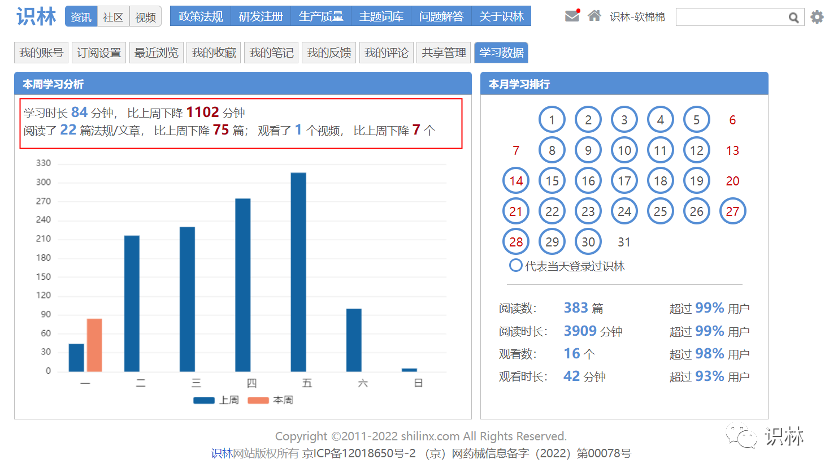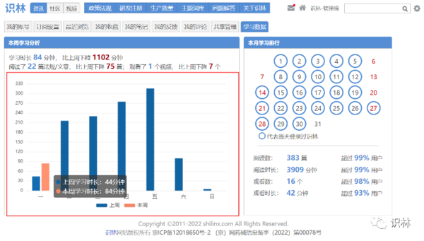 【识林功能简介】 个人学习数据:点点足迹,滴滴汗水