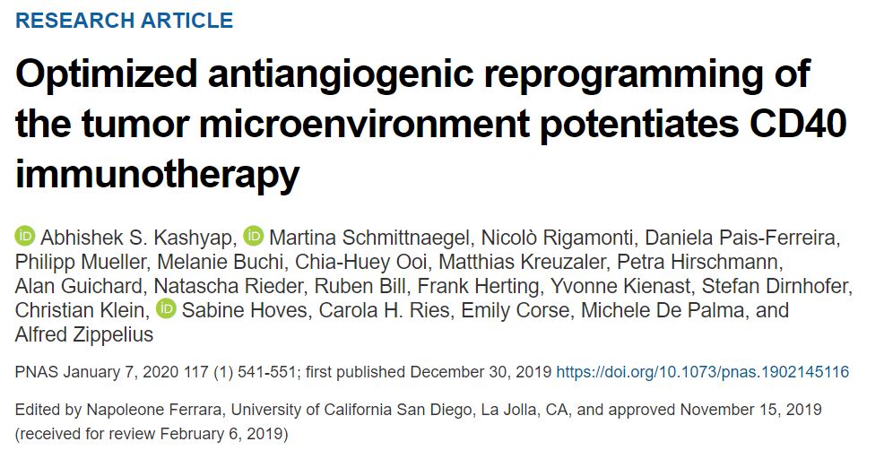 [1] Abhishek S. Kashyap el al. Optimized antiangiogenic reprogramming of the tumor microenvironment potentiates CD40 immunotherapy. PNAS (2019).