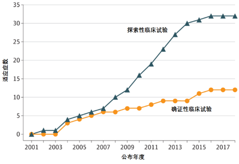 研究者将注意力集中在重磅炸弹式药品普瑞巴林(Lyrica)上。普瑞巴林是全球最畅销药品之一,标签外使用极其普遍。依靠公布的临床试验记录,研究者重建了普瑞巴林药物开发 的时间表,重构和了解临床医生和临床指南编制者在做出治疗决策和建议时可获得的证据,以及如何协调测试。该项研究系统回顾了238项普瑞巴林用于未获批适应症 的临床试验,其中大部分适应症(27项中的17项,占63%)可能会对普瑞巴林的疗效产生不确定性,这些不确定性问题在5年内并未在确证试验中得到解决。在检测至少33项适应症的238项临床试验中,其中5种适应症最终获得了EMA、FDA的上市批准。首次公布的新适应症中,67%(33项中的22项)可能产生了临床不可知论。在至少跟进5年的适应症中,63%(27项中的17项)显示但并未确证普瑞巴林可能对给定的适应症有效,在5年之内并未在确证试验中得以明确。随着普瑞巴林从获批的适应症扩展到其它适应症,探索性试验与确认试验结果公开披露之间的联系也减少。探索性和确证性试验之间协调性差,可能是临床实践指南中推荐标签外用药的重要手段,在没有确认性试验证据的情况下鼓励使用的一种手段。