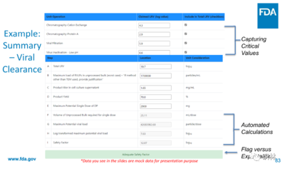 图14展现的是一个具体工序,关键工艺参数 和质量属性 都已数字化,可编辑可检索。值得注意的是,部分数据,如最大蛋白病毒负载之类的参数,是自动计算得出的(意味着这张表单背后也带有“算法”),同时,最下面的绿色部分是结论性内容,即“安全因素充分”(adequate safety factor),来自于预期标准和实际数据的对比。