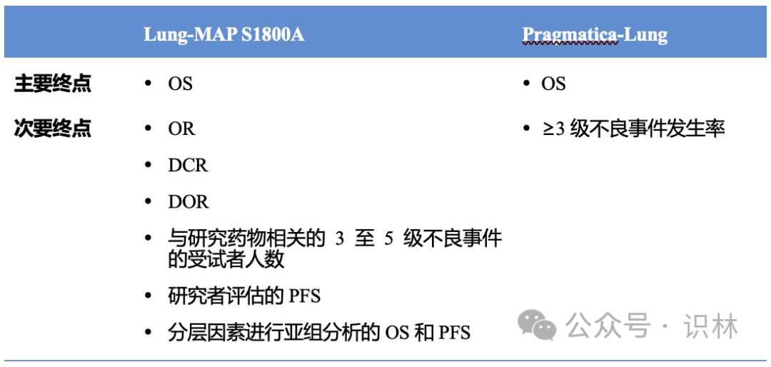 Pragmatica-Lung研究相比Lung-MAP S1800A试验,资格标准从52条简化为12条,对患者的PD-L1表达水平、既往病史、既往接受的抗PD-1/PD-L1治疗、生化水平指标等标准不再做出苛刻的限制或要求。此外,结果方面, Pragmatica-Lung研究以总生存期(overall survival,OS)为主要终点,与Lung-MAP S1800A试验一致。然而,在次要终点上两项研究体现出很大的不同(表1),Pragmatica-Lung研究有且仅有≥3级不良事件发生率,侧重于真实世界中具体的实践情况;而Lung-MAP S1800A试验包括客观缓解(objective response,OR)、疾病控制率(disease control rate,DCR)、缓解持续时间(duration of response,DOR)、研究者评估的无进展生存期(investigator assessed-progression-free survival,IA-PFS)等次要终点。两相对比可以发现,Pragmatica-Lung研究的独特设计旨在通过扩大资格标准和最大限度地减少数据收集以最大可能降低入组障碍和试验复杂性,从而重点关注与主要目标(总生存期)最相关的试验结果。希望试验设计越简单,试验越容易进行,执行越便利,越迅速地回答临床中的关键问题:联合治疗相对标准治疗能否为病人提供生存优势?