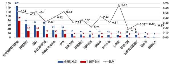 不同治疗领域中,美国产新药进入中国的比例存在差异。