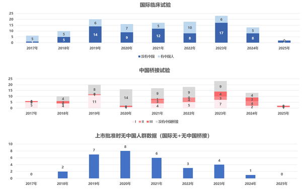 12. 本分析基于中国国家药监局药品审评中心(CDE)公开的审评资料,对125个进口创新药的临床试验 数据进行了整理。需要强调的是,这一样本并不涵盖所有进口创新药,因而所观察到的趋势具有一定局限,结论应谨慎解读。此外,数据来源于监管审评公开信息,旨在客观反映不同药物在获批前是否有中国患者参与国际多中心临床试验 ,以及是否在中国开展了附加的桥接研究 。