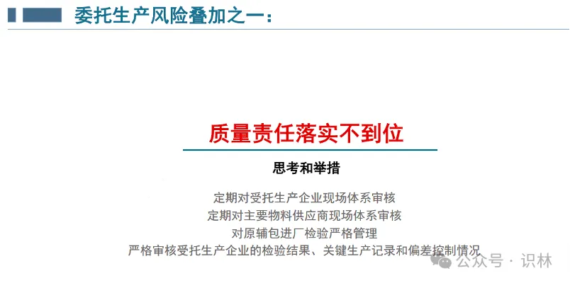自 132 号公告 发布实施以来已一年有余,该文件中强调的落实持有人的质量安全主体责任以及属地监管责任,在近期发布的《生物制品分段生产试点工作方案》 中也看到了同样的重点内容(识林已对分段生产主题相关内容进行了梳理,详情可查看【主题词】分段生产(生物制品) )。理解法规文件的起草思路,不仅知其然,更要知其所以然,才能在实践中更有的放矢,严控委托生产风险,确保持续合规。