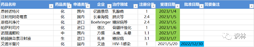 注:仅列出国产创新药和改良型新药,多受理号仅展示其中 1 个,供参考。企业用户可至识林“CDE 药品审评报告 ”按发布时间查阅最新的上市药品信息。