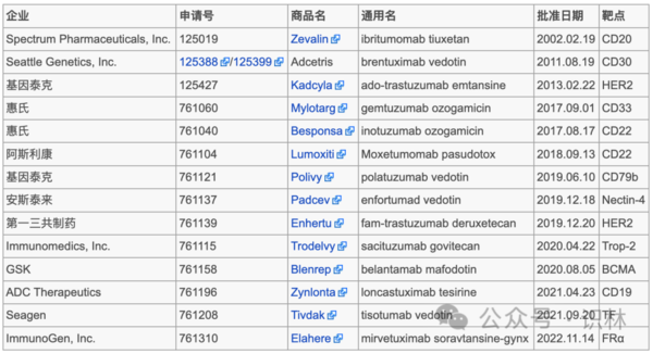 从本质上讲,化学家需要构建足够灵活的连接子,以确保化疗有效,但仍然具有足够紧的抓力,不会失控。更好的连接子也被证明可以携带更强大的有效载荷。下面是到目前为止 FDA 批准的 ADC 药物。