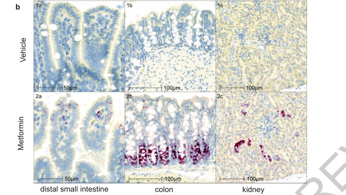 (4)通过检测小鼠服用二甲双胍后GDF15 mRNA在各组织中的水平, 表明至少在口服给药时,GDF15的mRNA在远端小肠、结肠和肾脏中的表达显著增加。与之前实验一致,肠是二甲双胍的主要作用器官,而在这篇文章中作者发现肠也是二甲双胍诱导GDF15表达的主要场所,提示二甲双胍可能在肠中通过这一通路发挥重要作用。
