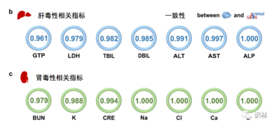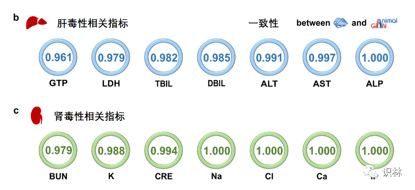 动物数据用于毒理学 评估的常见情景是,将治疗组的观察结果与其时间匹配对照组的观察结果进行比较以确定安全范围。作者比较了此情景下真实动物实验数据与AnimalGAN结果,测试集中观察到高度一致(即96.08% - 100%)。在临床和临床前研究的情况下,所预测的38项临床病理指标中,7项用于肝毒性评估(丙氨酸氨基转移酶ALT、天冬氨酸氨基转移酶AST、乳酸脱氢酶LDH、碱性磷酸酶ALP、γ-谷氨酰基转肽酶GTP、总胆红素TBIL和直接胆红素DBIL),另7项用于肾毒性评估(尿素氮BUN、肌酐CRE、钠、钾、氯、钙和无机磷)。基于AnimalGAN的评估与动物研究中肝毒性和肾毒性一致性分别为96.08%-100%和97.89%-100%(图4),表明AnimalGAN在无动物试验中的潜在用途。