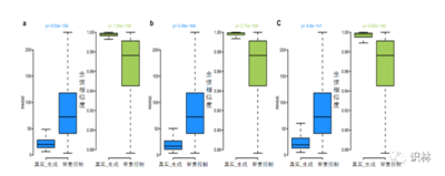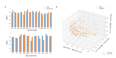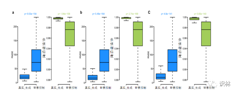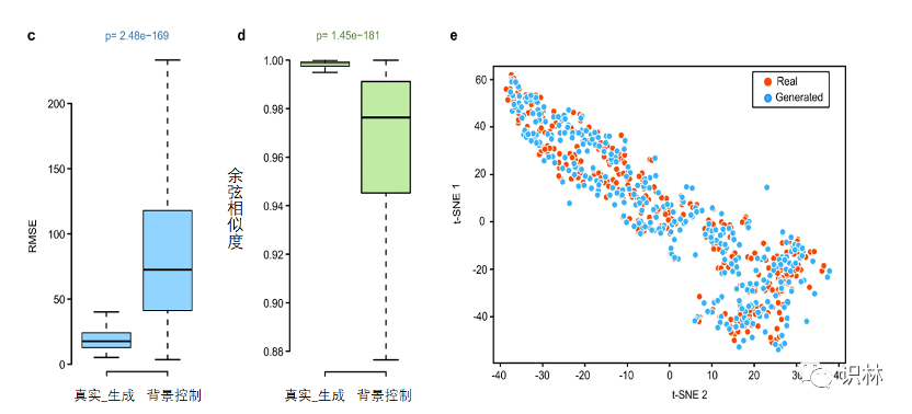 在测试集中观察到生成数据和真实的临床病理学指标之间高度一致性(图2c均方根误差RMSE17.58,显著小于背景对照的中位数72.46,Wilcoxon秩和检验p值 2.48×10-169 );高余弦相似性(图2d, 1.00,显著高于中位背景对照值0.98,Wilcoxon秩和检验p值1.45×10-181 )。t-SNE(T分布随机近邻嵌入)降温可视化显示了测试集的生成数据与真实临床病理学指标之间的高度相似性(图2e)。