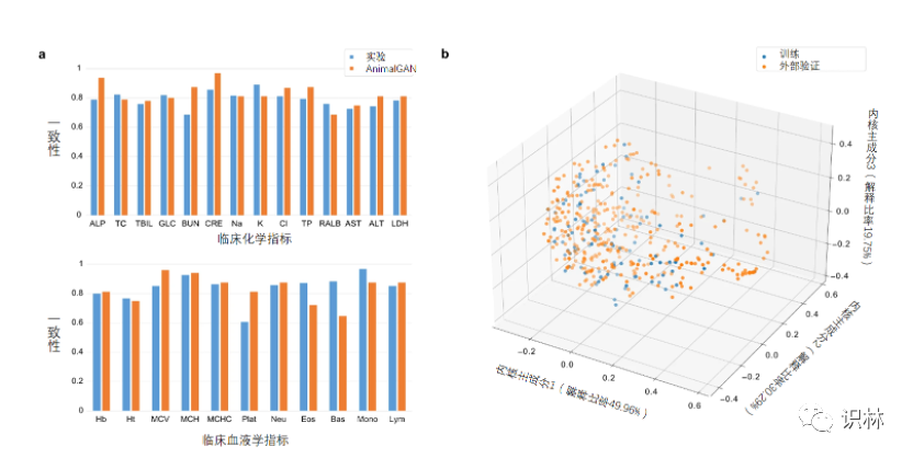 使用DrugMatrix数据集对AnimalGAN进行外部验证。临床病理学指标在不同的实验方案或不同的实验室之间可能差异很大。为此,作者分析了TG-GATEs和DrugMatrix都测试过的70种常见化合物(对应175种治疗情况)的实验数据,建立实验设置中的基线一致性。25项常见指标在两个数据集之间的总体平均一致性是81.20%。对于717种治疗方案下的355个化合物,AnimalGAN生成的结果和DrugMatrix的真实数据一致性是82.85%。作者还比较了25项临床病理学指标基线设置的一致性比较(图5a)。此外,作者还比较了训练集中的110个化合物和外部验证的355个化合物的化学结构,结果显示重叠并不显著(图5b),表明模型对不同结构的化合物可能具有广泛的适用性。