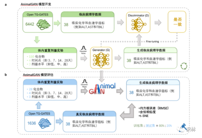 近来,生成式AI获得了很多关注,如chatGPT。生成式AI如GAN可以创造新的内容,通过学习传统的动物实验结果来生成未检测化合物的动物数据从而提供一种代替动物实验的方法。作者报告了一种用GAN方法开发的生成式AI叫做AnimalGAN,用于动物实验。AnimalGAN能够模拟虚拟的动物实验生成类似于传统动物实验的多维数据。具体而言,AnimalGAN利用传统的动物实验数据,建立药物暴露(药物、药物剂量和暴露持续时间结合)与临床病理学发现(如临床化学和血液学指标)的联系来生成未检测的新药在预定剂量和治疗时间内的临床病理学概况。