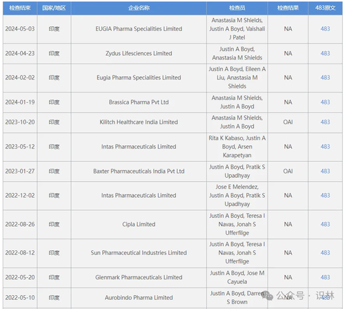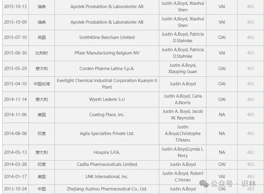 而Justin A. Boyd更是FDA杀手级检查员,在识林483和检查员数据库有超过50条记录,显示他从2019年开始的过去5年,集中精力在印度检查。不知是幸运还是不幸,这位检查结果超过1/3都是OAI(官方行动指示,即检查不通过)的检查员,因为疫情和非疫情的原因,顶住了美国国会施加给FDA一轮又一轮严查的压力,最近没来中国检查。