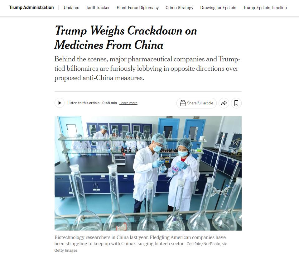 9月10日,《纽约时报》在官网发布报道《特朗普考虑对中国药品实施严厉管控》(Trump Weighs Crackdown on Medicines From China)。