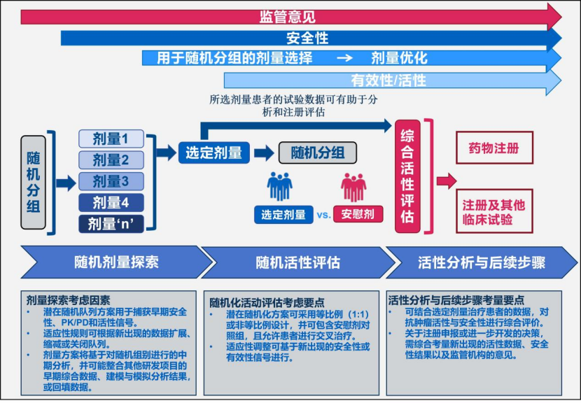 以注册为目的的无缝试验设计:Blueprint Medicines普拉替尼的ARROW试验,采用推断无缝设计,将剂量探索阶段患者数据纳入关键分析,成功支持普拉替尼在多个适应症 获批。类似设计也见于礼来塞普替尼的LIBRETTO-001和Turning Point Therapeutics联合再鼎医药的瑞普替尼药物的TRIDENT-1等试验。白皮书还提供了直观的结构概念模型,如下图。