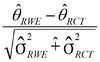 除二元判定外,还通过效果估值和置信区间的散点图以及标准化的差值,探索所有复制RWE结果和相应RCT结果之间的差值的大小和方向。标准化的差值计算公式如下,θ为治疗效果估值,最常见的是对数风险比,σ2是相关的方差(associated variances)