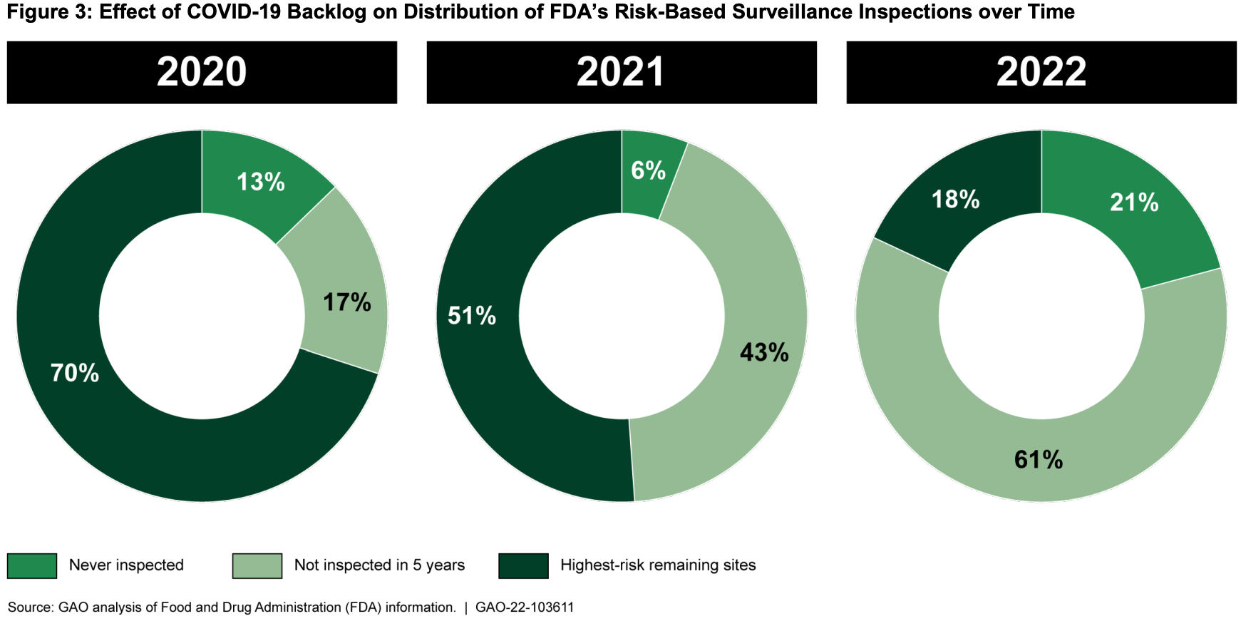 GAO 在报告中指出,由于新冠疫情的影响,FDA 计划的 2022 财年监督检查中,超过 80% 是针对从未检查过或在 5 年内未检查过的企业,相比之前下,2020 财年这一数据为 30%,2021 财年为 49%(见下图)。