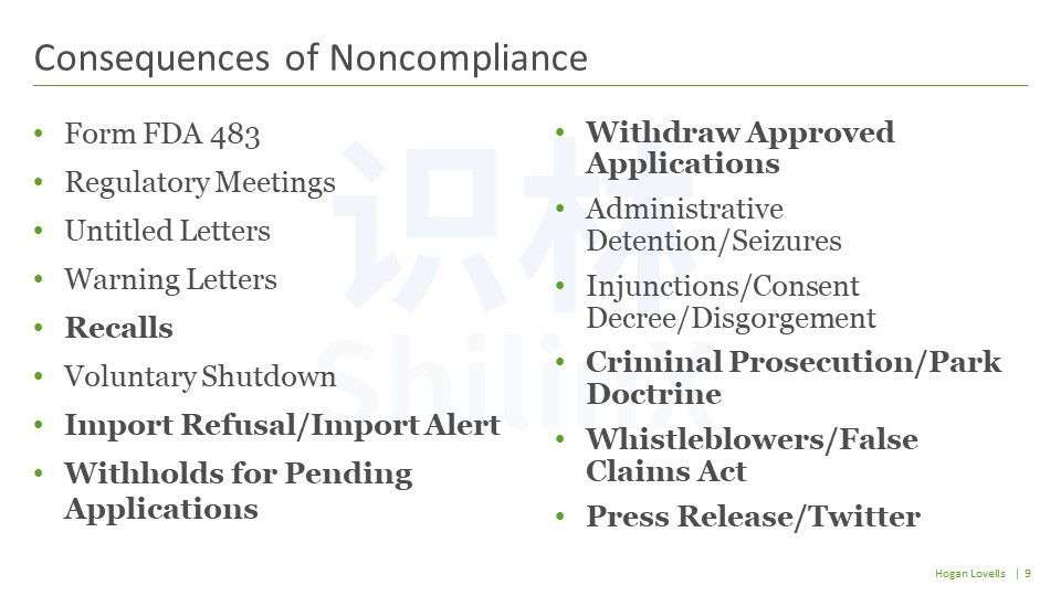 制药行业是高度监管的行业,没有任何一家制药公司没有所谓的生产问题、管理问题,或需要面对召回问题等,制药公司无法避免危机的发生。危机管理应该从发现合规的风险开始,首先需要理解法律法规要求,21 USC 331 定义了许多与药物相关的“禁止行为”,一项禁止行为的做法或导致的结果可能触发联邦民事或刑事案件,包括基于药物掺杂、错标或未经批准的潜在发现。若违规可导致483、监管会议、无标题信、警告信、召回、自愿关闭、进口禁令、未决申请被撤回、已批准申请被撤销、行政扣留/扣押、禁令/合意判决/收入退还、刑事诉讼/Park原则等监管措施,除此之外还可能要面对商业/合同诉讼、产品责任诉讼、投资方/股东诉讼、美国贸易代表办公室(USTR)对从中国进口的产品的看法等商业不良影响。