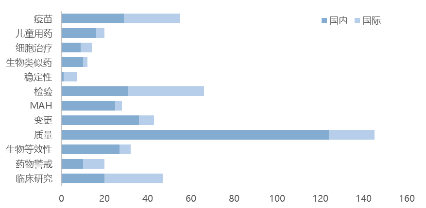在新增的2119篇政策法规及解读的热点话题来看,质量相关的最多,有将近150篇;受疫情影响,疫苗相关的政策法规及解读,国内外都有将近30篇,儿童用药和细胞及基因治疗是热度较高的产品。国内发布生物类似药相关的指南10篇,远高于国际。MAH的话题国内有超过20篇,也远高于国外。变更话题相关的政策法规及解读也有超过40篇。更多关于2022年新增的政策法规的详细分类,欢迎登录识林的法规指南数据库查找。
