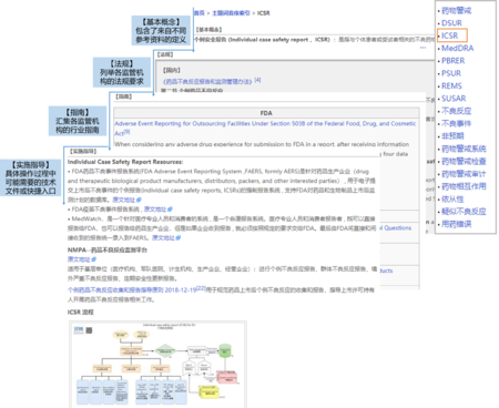 所谓“弱水三千”,你是否只想挑出你想要的那一瓢呢?识林早已帮你备好 — 药物警戒主题词。这部分的特色在于针对药物警戒过程中的每一个步骤详细讲解了不同监管机构的不同要求,它从基本的概念出发,囊括了各个监管机构的法规指南,再到最后的案例解析,这一部分从横向的角度对药物警戒的内容加以阐释。以ICSR为例,具体使用方法参考下面图示: