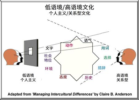 高语境文化(high-context culture)与低语境文化(low-context culture)由爱德华·霍尔(Edward Hall)最早在1976年在《超越文化》中提出。在高语境文化中,大部分信息存在于物质语境中,或内化于交际者的思维记忆深处,信息的传递和编码取决于社会文化环境和交际者所处的具体情景,显性清晰的编码所负载的信息量相对较少,人们对交际环境的种种微妙的提示较为敏感。在低语境文化中正好相反,人们在交际时,大量的信息通过显性直白的编码承载,隐性的环境传递出相应的信息和情景,暗示的信息较少。高语境文化与低语境文化及交际的特点:高语境文化 — 内隐,含蓄;暗码信息;较多的非言语编码;反应很少外露;圈内外有别;人际关系紧密;高承诺;时间处理高度灵活。低语境文化 — 外显,明了;明码信息;较多的言语编码;反应外露;圈内外灵活;人际关系不密切;低承诺;时间高度组织化。中国通常被认为属于高语境文化国家。