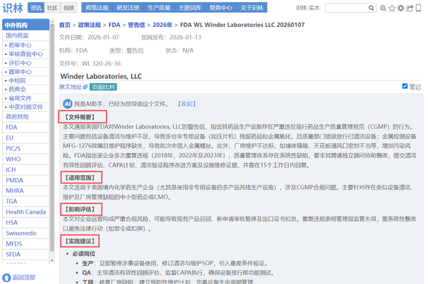 一个新的变化是,识林将会员们喜闻乐见的AI 导读引入了483和警告信,为大家先“读缺陷”,高效抓取关键信息。详见文末。