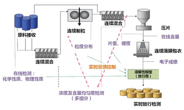 需要同样操作的片剂连续制造,连续制造的概念如图2所示。同样混合、制粒、压片和包衣的操作,通过设备和控制系统设计,使得每一单元操作之间物料/产品不间断通过。片剂的例子中,实时监测和控制将制粒操作后测得的粒度分布、最终混合操作后测得的多组分含量均匀度、以及压片操作后测得的片重和硬度构成实时联动的反馈控制系统,并结合物料的物理和化学性质,生成模拟出用于放行的溶解度模型,并对包衣后的制剂进行实时放行检验。突出的特点为: