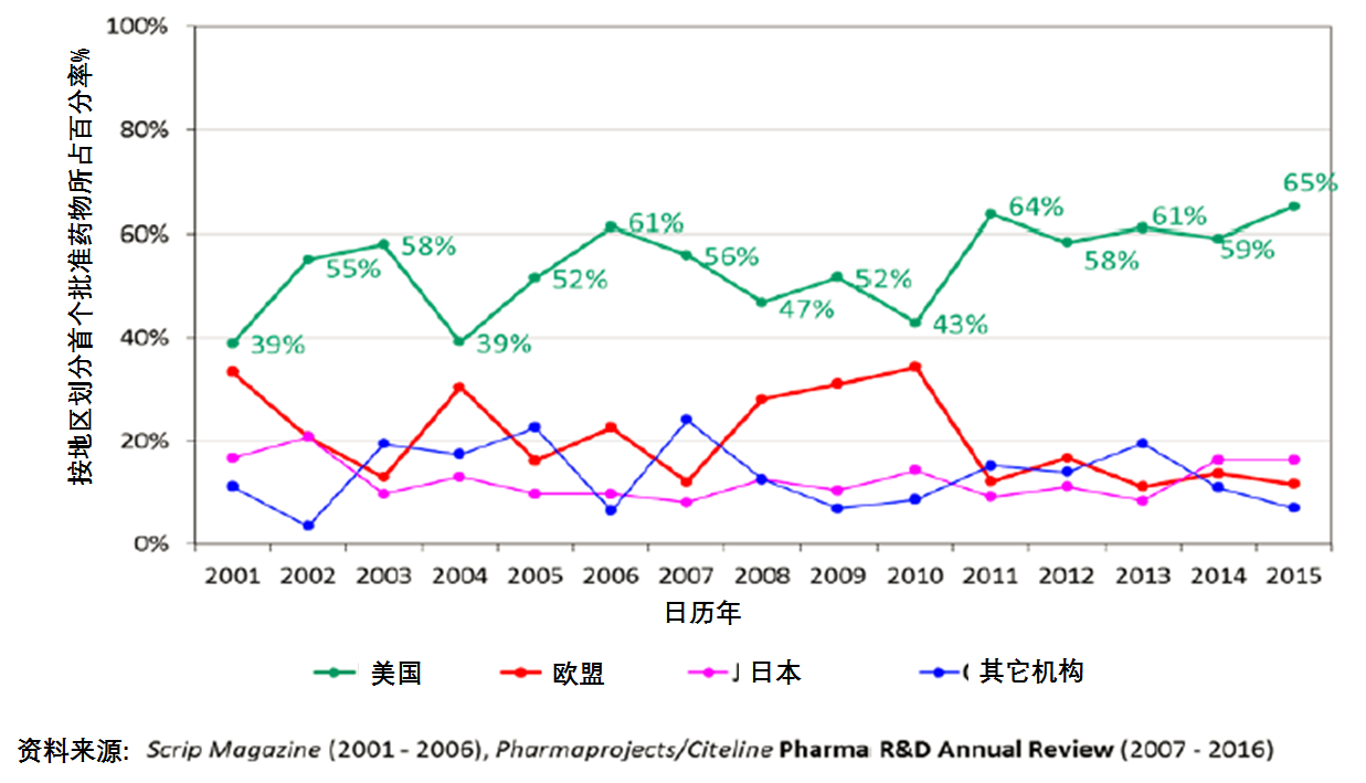 - 2001-2015年美国与欧盟全球首个新上市药物分布