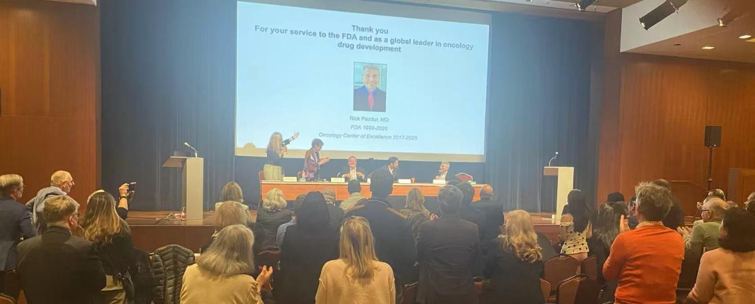 如果说去年的峰会是致敬前FDA药品中心主任Janet Woodcock医学博士多年来对药品监管的贡献的话,今年就是致敬Pazdur医学博士对肿瘤药监管的贡献了。他发言结束后,全场不约而同地起立鼓掌。从会场气氛看,他是很受大家爱戴的。当场有人呼吁他重返FDA,他答:“我永远不会离大家而去。”(I will never leave you)下图中,Pazdur坐在台上最左端。