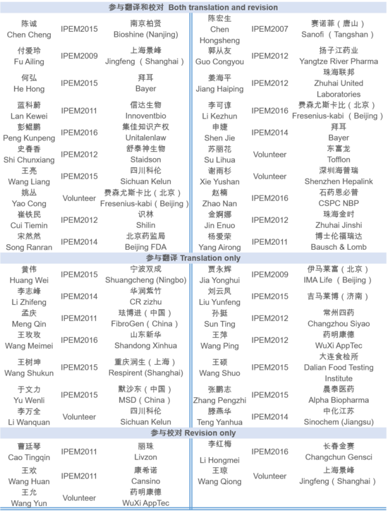 这封赞誉信源于2017年8月起,40余位IPEM成员(见表1)历时近8个月,完成了88篇CMC和GMP的关键行业指南和检查指南的翻译,并通过识林发布,只要在识林App上免费注册就可以学习和应用大多数指南(详见表2)。8个月中,3个月用于指南初稿的翻译,而校对和标准化历时5个月,强调的并非个别指南的文字优美或贴近汉语习惯,而是用词的系统化和一致性,翻译的准确性和完整性。