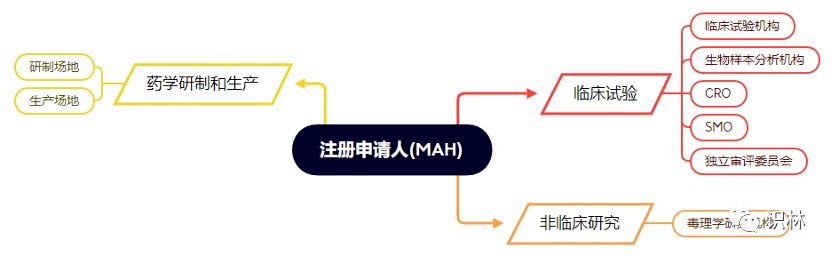 (2)申请人企业对于自己的合规信息可以做到充分收集和保存,但对产品从研发走到临床结束的其他相关方的信息就会缺失。在本文件中是分别介绍了药学研制与生产、药物临床试验、药理毒理学研究三大部分的合规信息内容要求的。因此,与一个要注册申请的药品有关的主体不止申请人企业一家,至少就有下图所示的多个不同角色