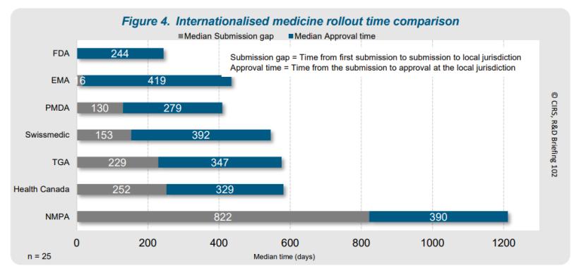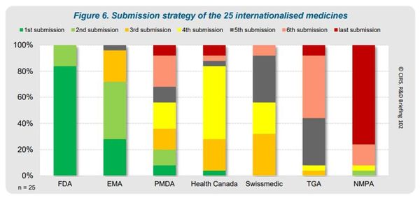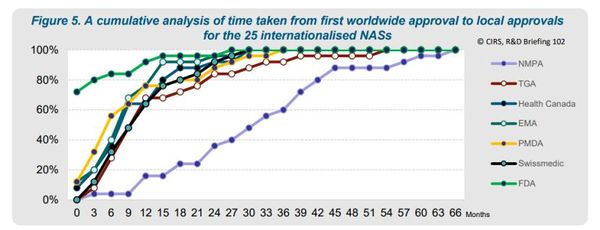 有些企业效率本就较高,11种NAS在两年至三年内向七家机构提交,6种在一年内完成全球提交。FDA在70%的国际化药品中率先批准或在首次全球批准后一个月内批准。其他市场也相对迅速,中国批准上市的延迟还是归因于企业提交策略。