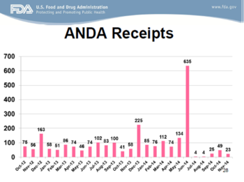 我们现在已处在2015财年的第二季度,2015财年同样也是GDUFA申请队列的第3年。对于这个申请队列,FDA承诺15个月内对60%的原始ANDA审评并采取行动(绩效目标在2016财年[GDUFA第4年]逐渐升高至15个月对75%原始ANDA采取行动,在2017财年[GDUFA第5年]调高为10个月内对90%的原始ANDA采取行动)。GDUFA也涵盖了2015财年其他方面的绩效目标,包括对已获批申请的补充申请(PAS)和受控函(Controlled Correspondence)的相关目标。