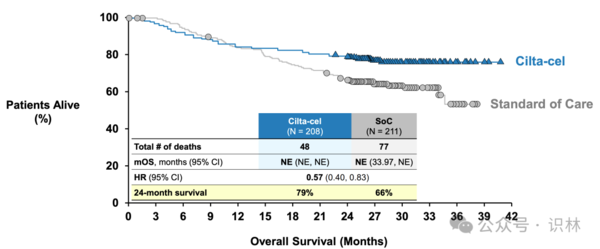 基于 CARTITUDE-4 惊人的进展生存期和积极的总生存期(OS )数据,专家组成员仍然相信强生和传奇生物的申请,这些数据在最终分析之前大约完成了一半。总生存期曲线表明,随着试验的进展,Carvykti 的优势不断扩大。