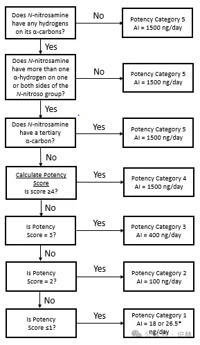 预测亚硝胺结构的致癌效力类别及其相关推荐的可摄入限度的CPCA流程图。*可摄入限度为18 ng/天或26.5 ng/天,取决于监管区域。