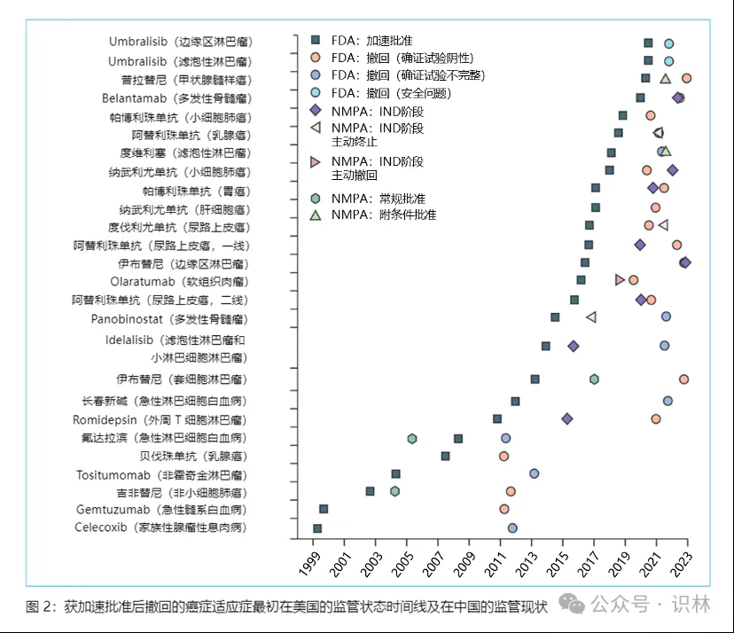大多数在美国获得 FDA 加速批准后被撤市的肿瘤适应症的确证性临床试验结果为阴性,所有这些阴性确证性临床试验均为随机对照试验,并将总生存期作为主要或次要疗效终点。广泛用于预测总体生存获益的肿瘤替代终点一直存在争议。替代终点有时不能转化为肿瘤患者总生存期获益的原因复杂且众多,包括严重的药物毒性反应,允许对照组患者交叉到实验组,以及由于研究并不是围绕总生存期作为主要疗效终点而设计导致潜在的统计功效(statistical power)不足。因此,仅通过判断替代终点的改善来预测总体生存获益变得越来越具有挑战性。尽管 FDA 于 2018 年首次发布了一份表格,列出了其用作加速批准程序的替代终点,但这些替代终点与总生存期的相关程度并未公布,同样有研究表明中国附条件批准的抗肿瘤药物的替代终点与总生存期之间缺乏既定证据。这些都强调了全球合作建立替代终点与总生存期之间相关性数据库的重要性。