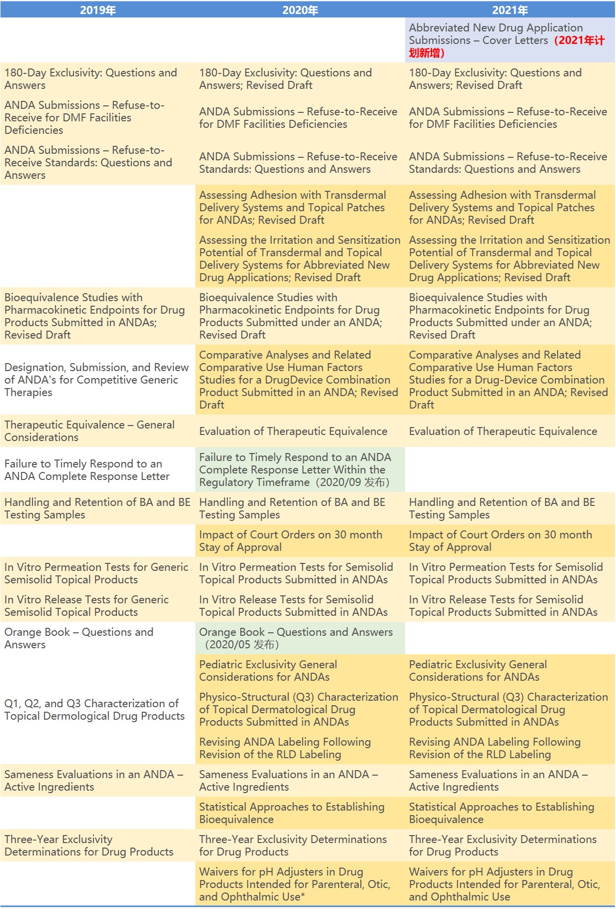 2021 年指南计划清单中列出的指南数量最多的是仿制药类别,共计划发布 20 篇指南,但是其中仅有一篇是 2021 年计划新增的,而另外 19 篇是在 2020 年指南计划上但未如期发布的指南。通过下表可以一目了然的看出哪些指南拖延了多年仍未发出,这些未如期发布的指南中相当多是业界极为关注的内容。