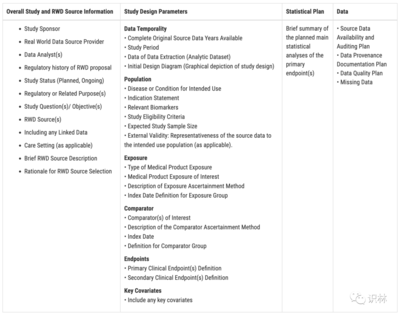 FDA 对肿瘤学 RWD 申报的初步经验表明,包含 RWD 的研究的早期提案通常缺乏研究设计的基本要素和数据源的表征,无法帮助审评团队进行适当评估。此外,收到的信息的类型和格式差异很大。此过程通常会要求提供额外的信息,从而导致效率低下和不必要的延误。