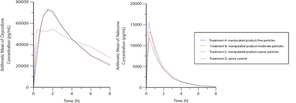 该研究的PK结果显示,尽管粒径范围不同,三种处理过产品中羟考酮和羟吗啡酮的吸收速率和程度(早期程度除外)具有可比性 (峰浓度[Cmax ]和从零到无穷大的曲线下面积[AUCinf]的90%置信区间 在80.00-125.00%的可接受范围内,图1)。对于羟考酮,随着粒径增大(A < B < C),早期吸收程度(AUC 0-0.5,0-1,和0-2)降低;而对于纳洛酮,随着粒径增大,观察到吸收速率和程度降低(图1)。
