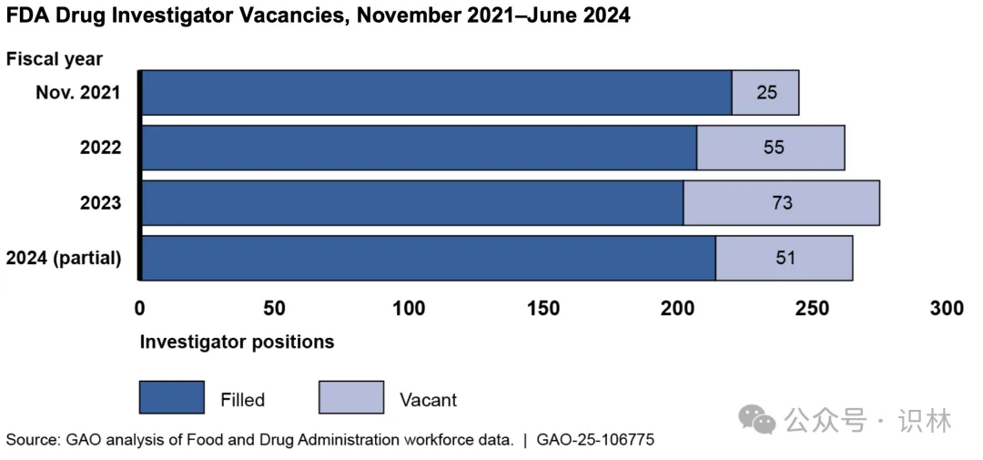报告称,FDA 药品检查员的空缺职位从 2021 年 11 月的 25 人(总共约 250 名检查员)增加到 2023 年的 73 人。