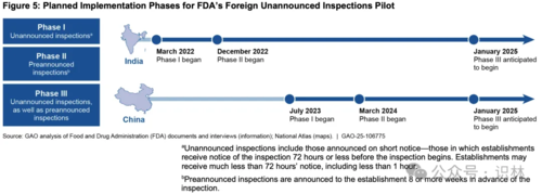 根据 FDA 关于试点状态的报告,截至 2024 年 5 月,FDA 已在印度启动了 114 次试点检查(其中 94 次为突击检查),在中国启动了 28 次试点检查(其中 16 次为突击检查)。FDA 计划在每个阶段继续试点实施,直到在两个国家完成总共约 250 次突击检查和约 250 次预先通知的检查。