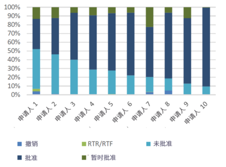 另一重要观察是一小批申请人 掌握有大量提交。例如,提交原始申请和补充申请 的申办人有超过 1000 家,但按提交量排名前十的申请人占有所有提交的 20%。通过审查这相同的十个申请人在 2018 财年的提交结果,可进一步了解提交质量(图 10)28 。提交量最高的申请人拥有更高的未批准产品率(即,完全回应结果)。排名前二的申请人的完全回应数超过批准数。这凸显了申请人需要专注于提交质量,而不是数量。