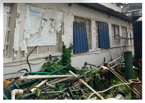 此外,检查还发现了严重的漏水损坏。一楼地板覆盖着泥土残留物,天花板和墙壁因漏水出现褐色变色,在成品储存区域的天花板上甚至观察到绿色霉菌样残留物。