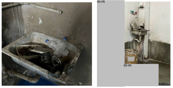 第三组照片重点记录了生产区域内的洗手池。检查员发现,企业将生产区域内的洗手池作为清洗生产设备的水源。照片显示,这些洗手池本身处于极度不卫生的状态,池内堆放了塑料瓶、金属零件和各类杂物,池壁和周围墙面存在明显的污垢、水渍和损坏。