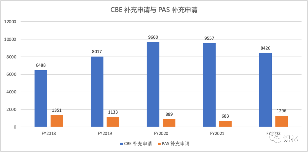 对于生效变更(CBE)补充申请,OGD 在 2022 财年收到 8426 份,在 2021 财年收到高达 9557 份。这可能代表支持 OGD 化学审评的药品质量办公室(OPQ)的工作量放缓。2022 财年收到的需事先批准的补充申请(PAS)总计 1296 份,2021 财年由 1351 份,略有减少。对于许多 PAS 补充申请,需要消耗更多的资源来审评这些补充申请。