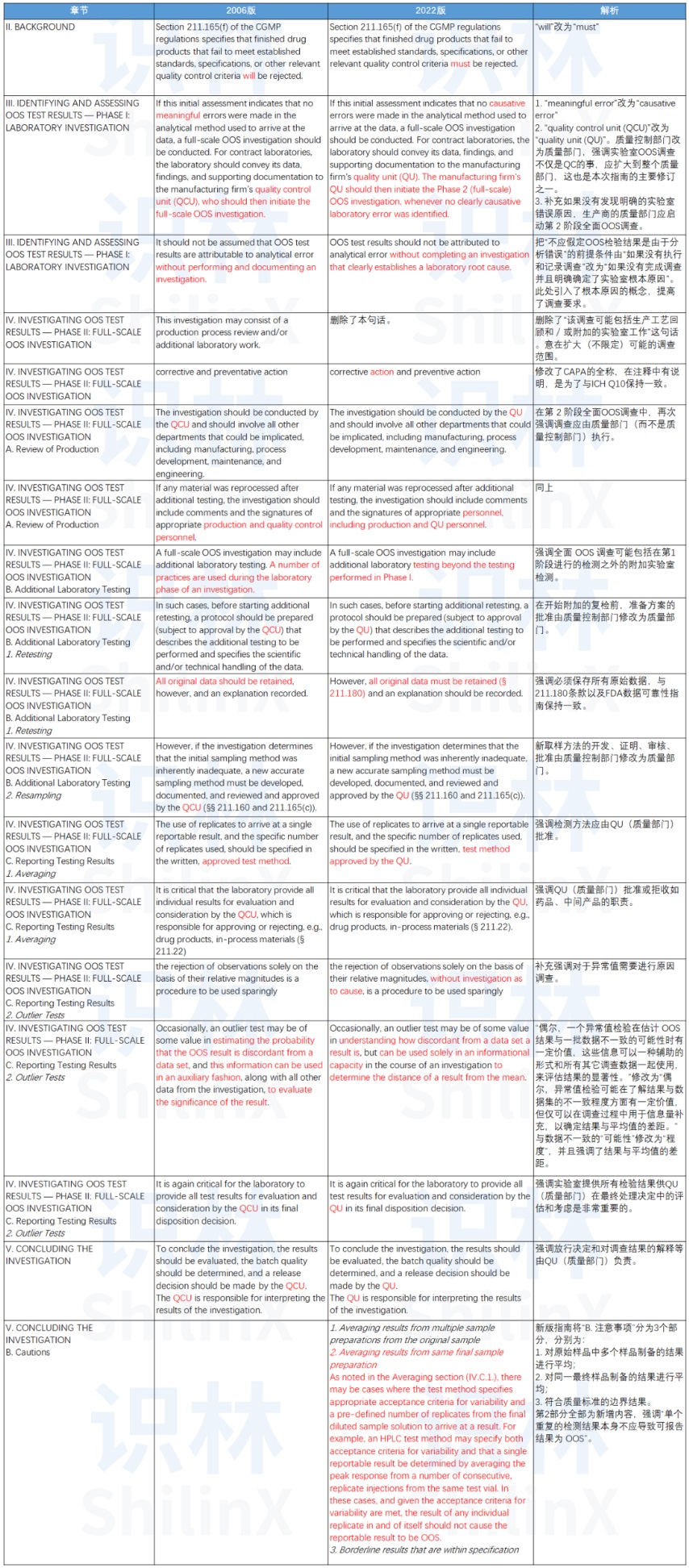 表1. FDA OOS 指南2022版与2006版主要修订内容对比、解析